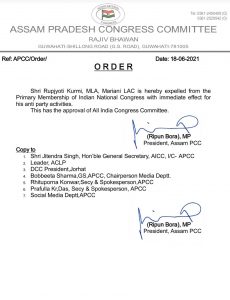 ৰূপজ্যোতি কূৰ্মীক কংগ্ৰেছৰ পৰা ইতিমধ্যে বহিষ্কাৰ কৰা হৈছে । সভাপতি ৰিপুণ বৰাই বহিষ্কাৰ কৰিছে মৰিয়নিৰ বিধায়ক ৰূপজ্যোতি কুৰ্মীক । দলৰ প্ৰাথমিক সদস্য পদৰ পৰা ৰূপজ্যোতি কূৰ্মীক বহিষ্কাৰ কৰিলে ৰিপুণ বৰাই। দল বিৰোধী কাম-কাজৰ অভিযোগত বহিষ্কাৰ কৰা হৈছে বুলি এক পত্ৰযোগে অসম প্ৰদেশ কংগ্ৰেছে কৰিলে ঘোষণা, যত স্বাক্ষৰ কৰে সভাপতি ৰিপুন বৰাই ।